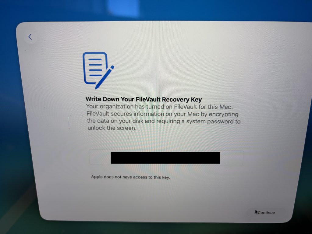 If you would like to, write down the FileVault Recovery Key. This is used in case your laptop crashes. However, if you lose the key, IT is able to get the key and provide it to you. Click Continue