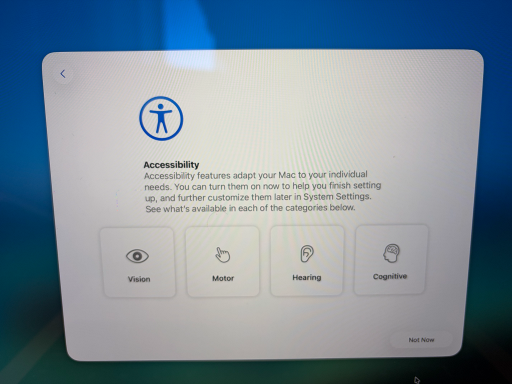 If you have an accessibility, go ahead and set it up. If you don’t have a need for Accessibility, click on Not Now.