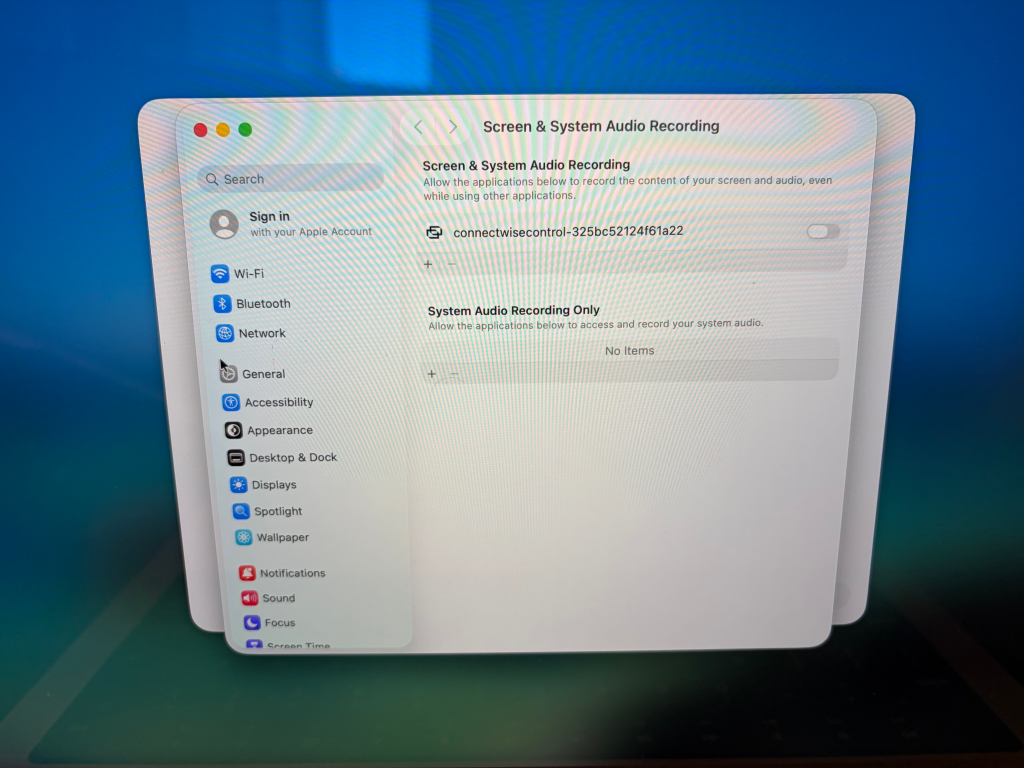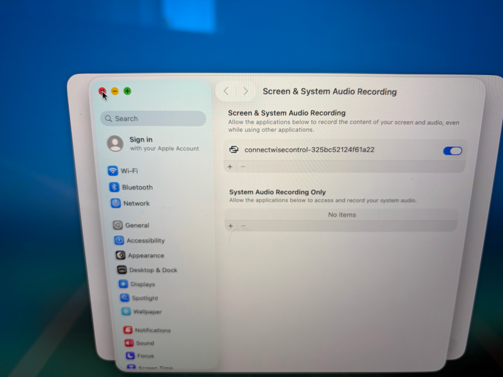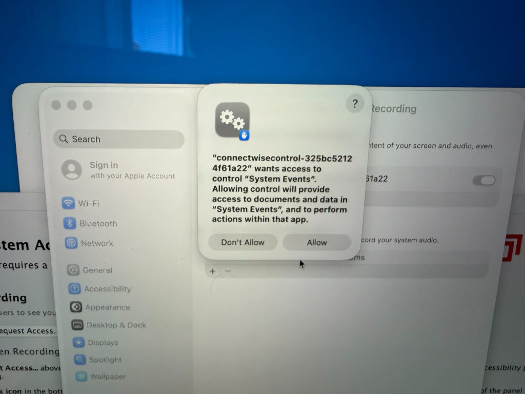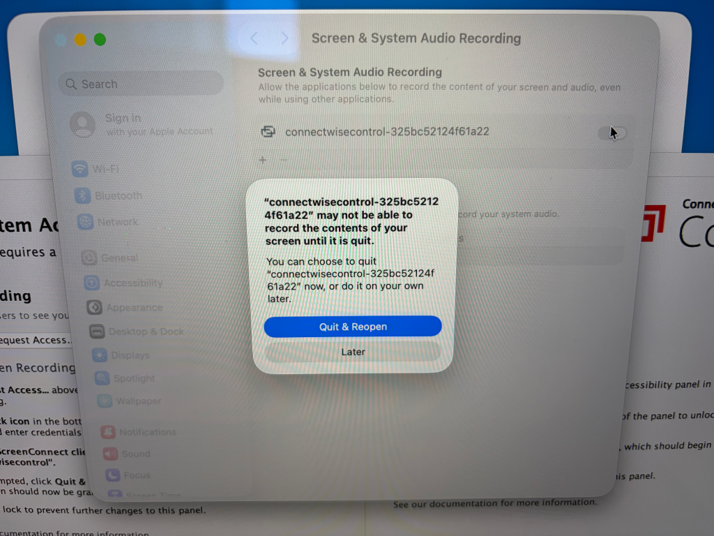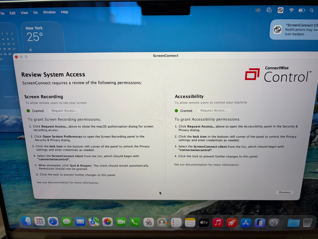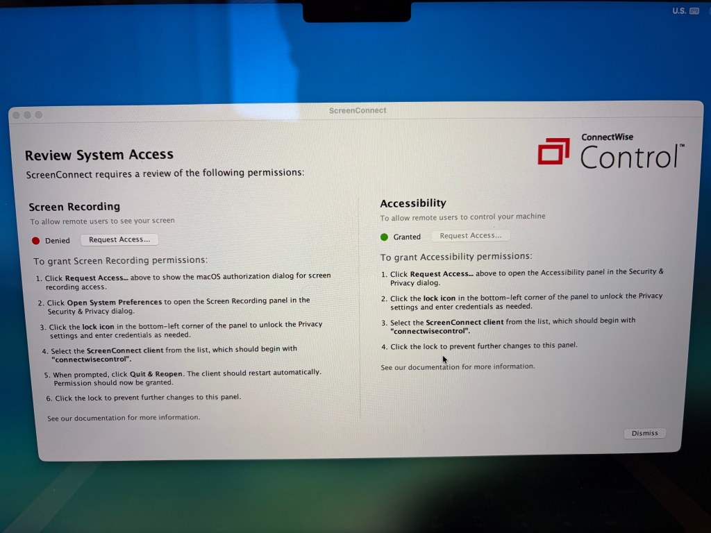 A window will appear for ConnectWise Control ScreenConnect. This software is what IT uses to be able to remote into your PC if you are having an issue. Click on Request Access… for Screen Recording