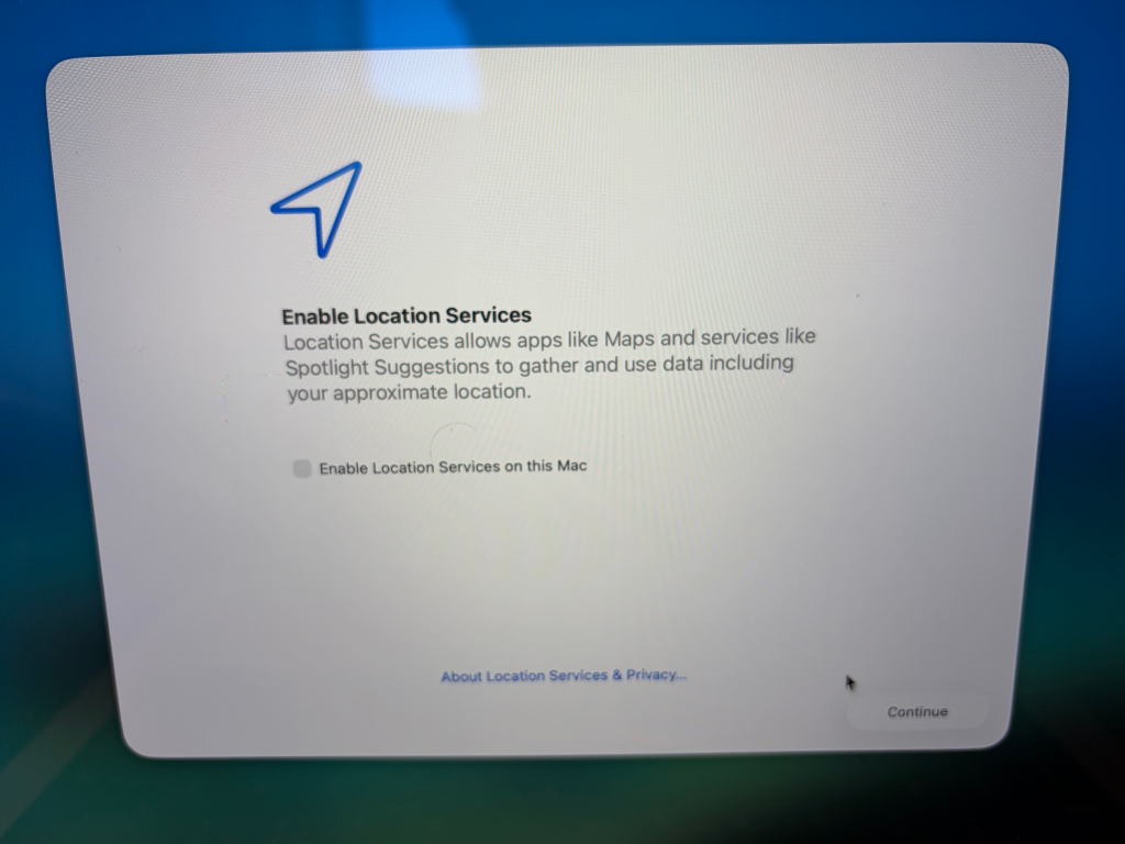 Click the checkbox on Enable Location Services and click Continue. This is used for setting your time zone, using Map websites and map applications.