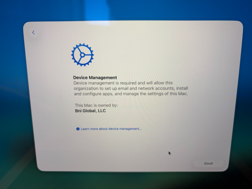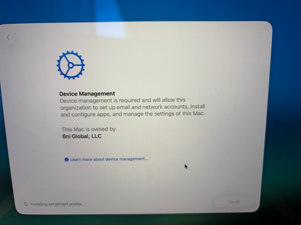 You’ll receive a message that the Macbook is under device management. Click on Enroll